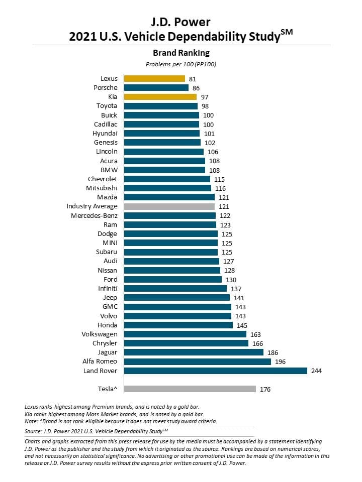 The J.D. Power 2021 U.S. Vehicle Dependability Study (VDS), ranks Lexus the highest in overall vehicle dependability among all brands with a score of 81 PP100.3 This is the ninth time in 10 years that Lexus has received this honor! The study measures the number of problems per 100 vehicles (PP100) experienced during the past 12 months by original owners of three-year-old vehicles. The study looks for 177 specific problems and a lower score reflects higher dependability. In this year’s study, Cadillac was given a score of 100 PP100, which means 19 additional problems were reported by Cadillac owners compared to Lexus.